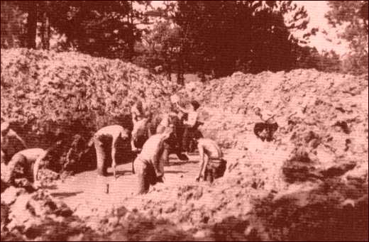 Z pośród zgromadzonych na boisku szkolnym Żydów pierwszy pluton wybrał grupę od 50 do 60 mężczyzn, wyglądających na dostatecznie silnych i zdrowych. W chwilę potem zaopatrzono ich w łopaty i wyprowadzono do lasu znajdującego się kilometr dalej. Tam otrzymali oni zadanie polegające na wykopaniu dołu pod zaplanowaną wcześniej egzekucję.[20]